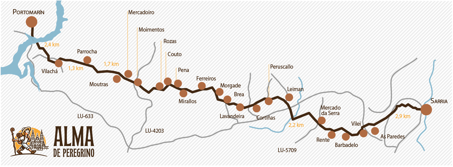 | Servicios en ruta | ~14 (albergues y bares en As Paredes, Vilei, Barbadelo, Rente, Mercado da Serra, Moutrás, Ferreiros, Mirallos, Mercadoiro/Moimentos, Moutrás y Portomarín) |